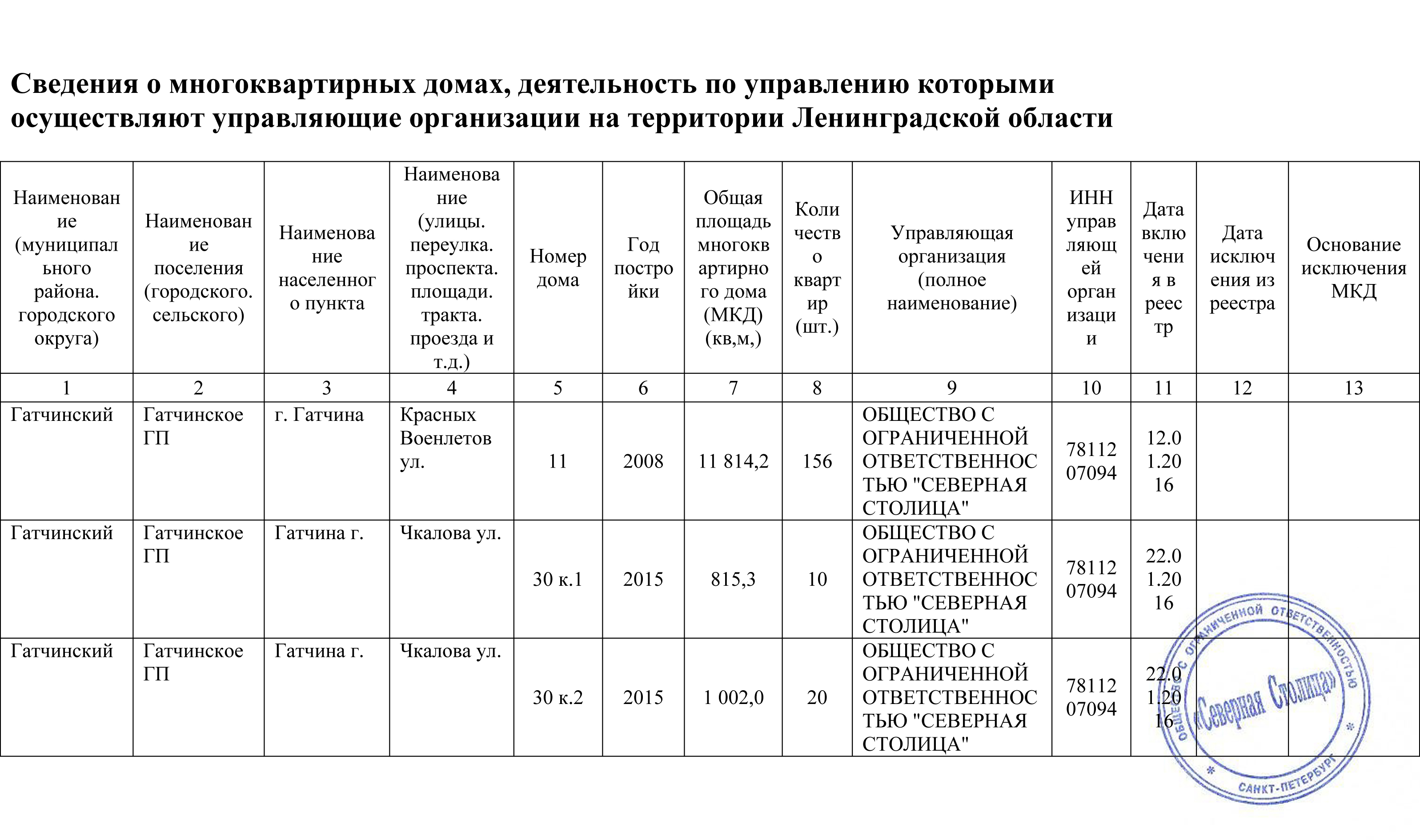 Выписка из раздела №5 ГЖИ Ленинградской области-Сведения о МКД,находящихся в управлении ООО "Северная Столица"